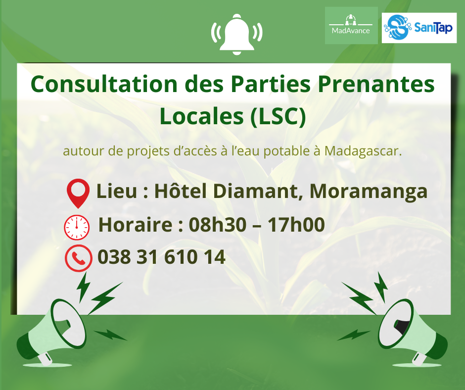 L’ONG MadAvance, en partenariat avec SaniTap, organise une Consultation des Parties Prenantes Locales (LSC) autour de projets d’accès à l’eau potable à Madagascar.